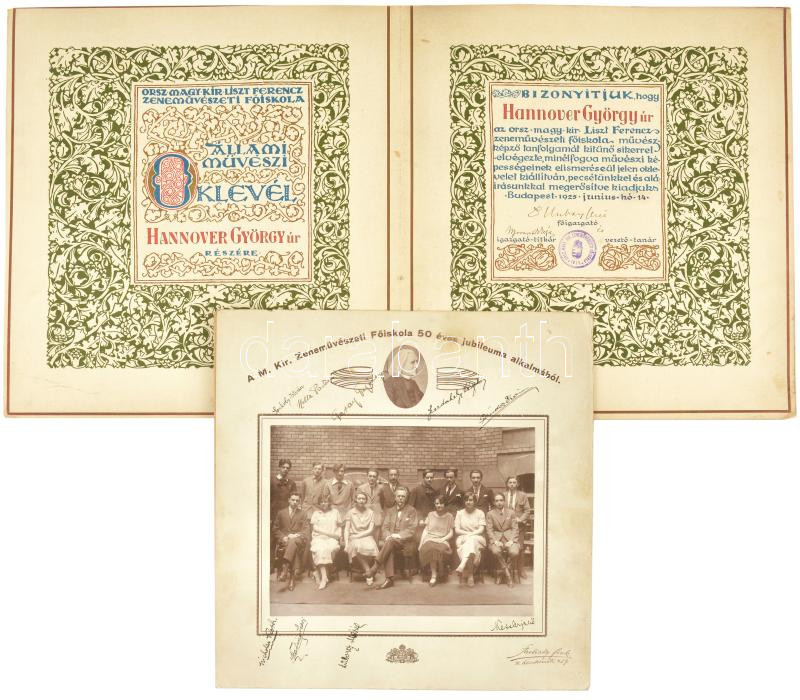 1925 Liszt Ferenc zeneművészeti főiskola díszes oklevele Hubay Jenő és Moravcsik Géza autográf aláírásával. Hannover György (1907-1935) hegedűművész, a budapesti hangversenyzenekar hangversenymestere, a Waldbauer - Kerpely vonósnégyes tagja részre. Hozzá tartozik egy aláírt csoportkép fotó, többek közt Garay György (1909-1988) hegedűművész, tanár, Liszt Ferenc-díjas érdemes művész autográf aláírásával. Kétszer 10000 korona okmánybélyeggel. Oklevél hátoldala kissé foltos, fotó kartonja szélén kissé sérült. Oklevél: 35,5x33,5 cm