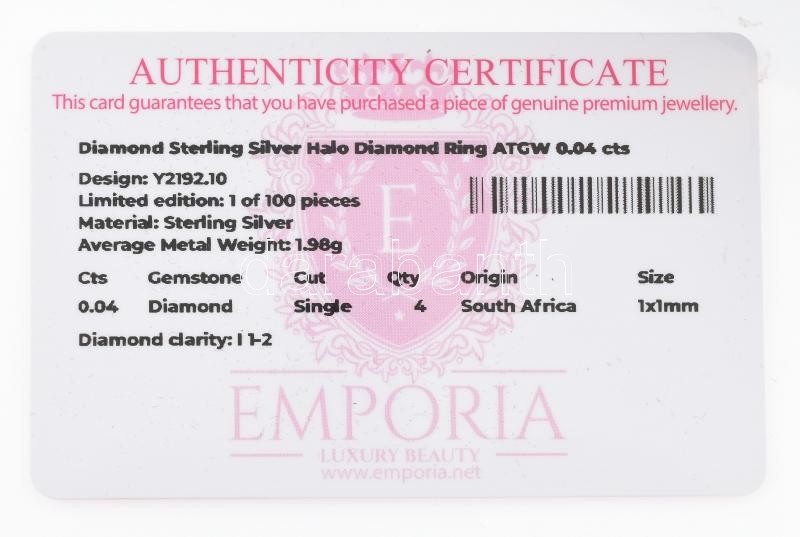 Leírás: Ezüst (Ag) gyűrű 0,04ct brillel ékítve, bruttó: 1,98 g , m: 63. Tanúsítvánnyal
