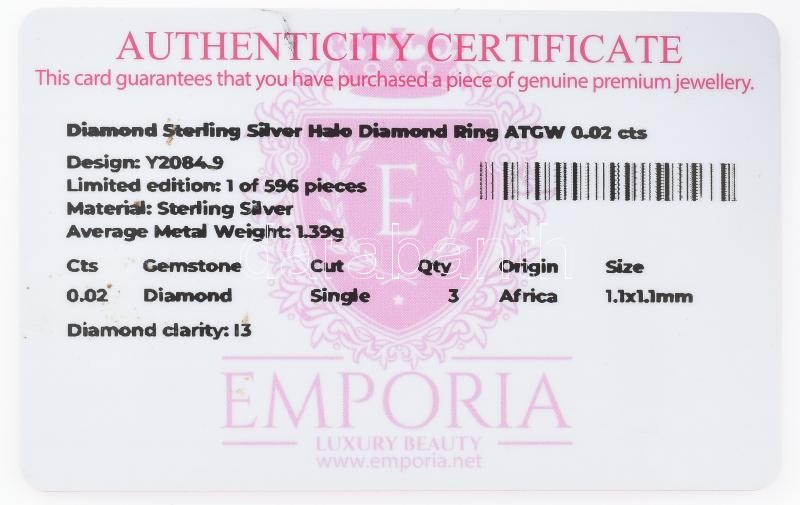 Leírás: Ezüst (Ag) gyűrű 3 db gyémánttal 0,02 ct, certifikáttal 1,5 g m:59 Tanúsítvánnyal