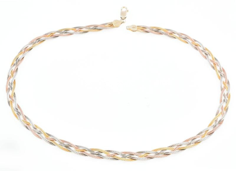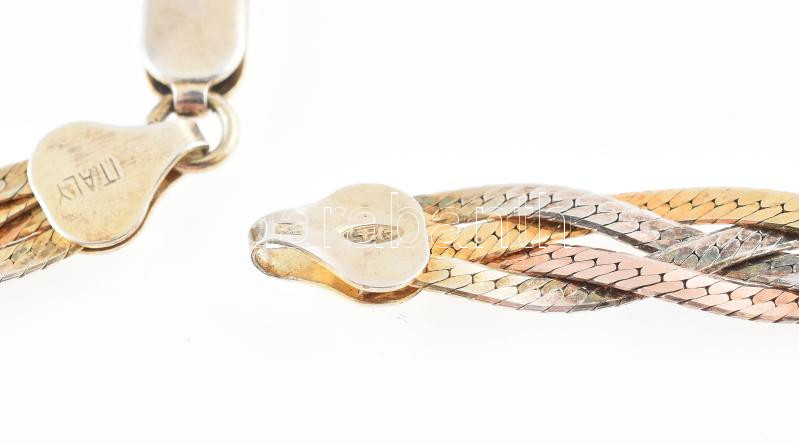Leírás: Ezüst (Ag) négy szálas aranyozott, fonott nyaklánc, jelzett, h: 45,5 cm, nettó: 14,4 g