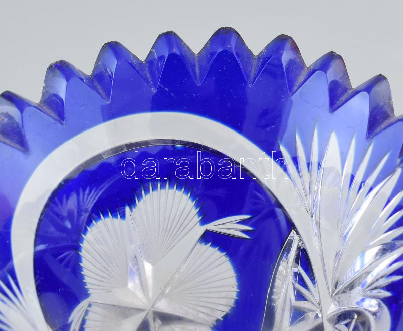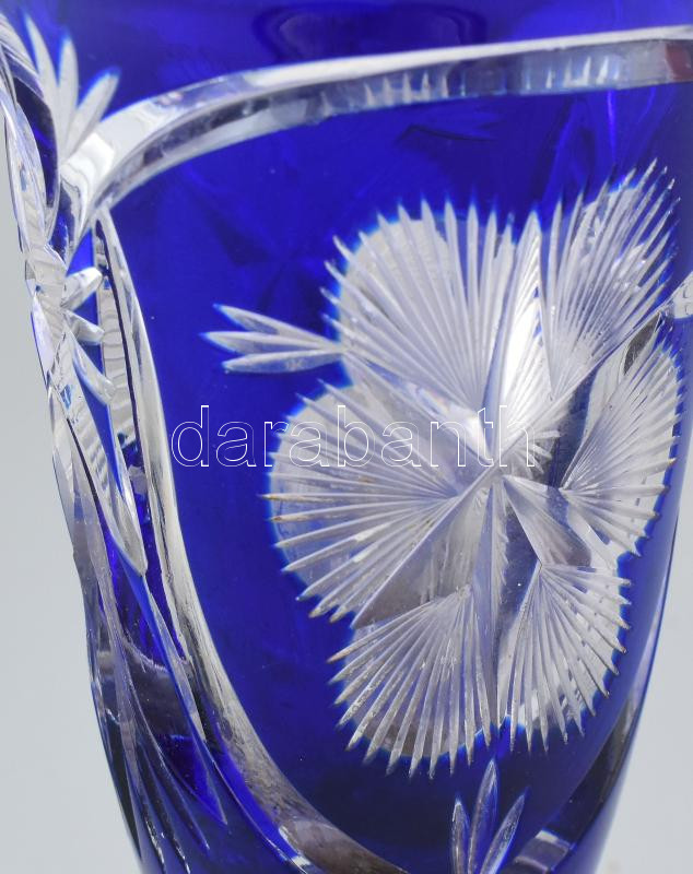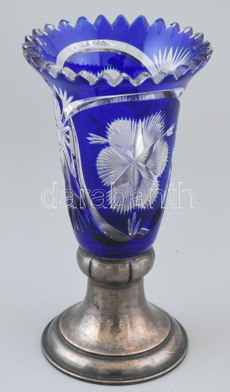Leírás: Ezüst (Ag) talpú, kék ólomkristály váza, jelzett, kis lepattanásokkal, m: 20 cm