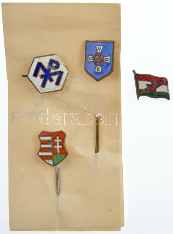 Leírás: 4db zománcozott fém kitűző, közte ~1930. "MORS" a ciszterci rend zománcozott fém kitűzője (13x10mm) T:2 zománchiba, az egyikről letört a tű