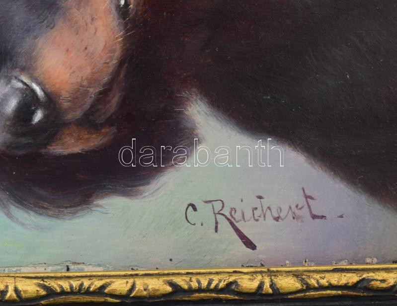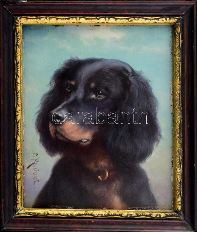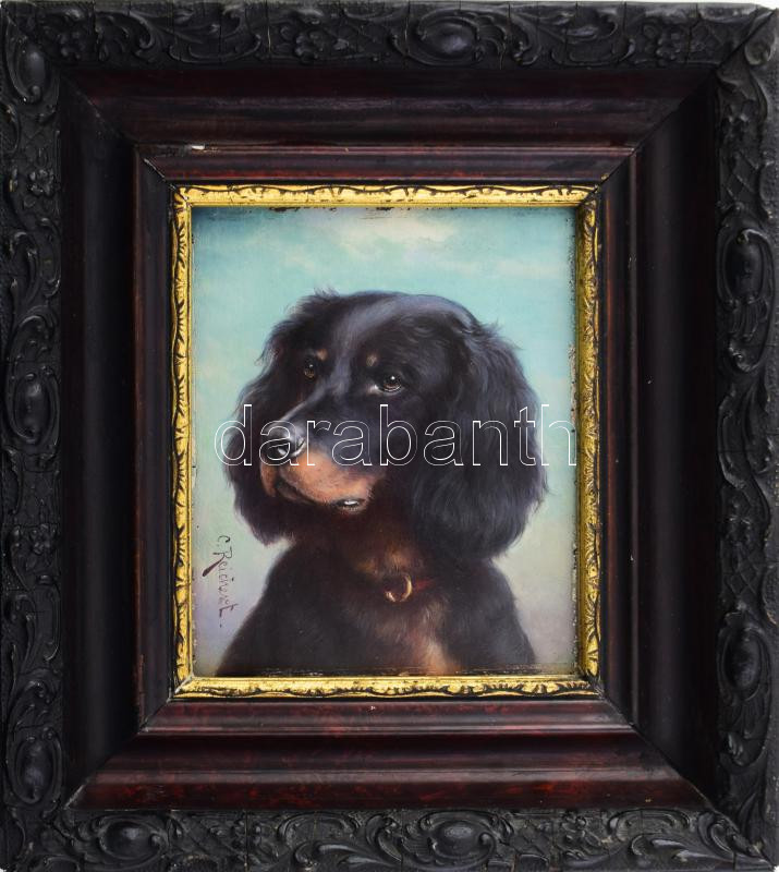 Carl Reichert (1836-1918): Kutyaportré. Olaj, fatábla, jelezve balra lent, szélein keretezésből adódó apró felületi sérülésekkel, antik fakeretben, 17×14,5 cm. / Carl Reichert (1836-1918), Austrian painter: Dog portrait. Oil on wood, signed lower left, minor surface damages on the edges due to frame, 17×14,5 cm.