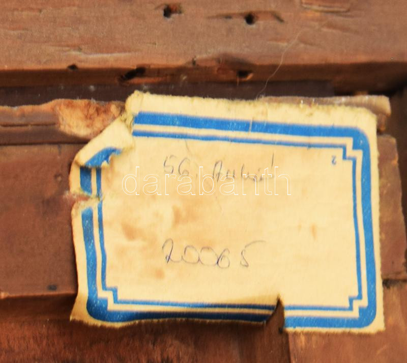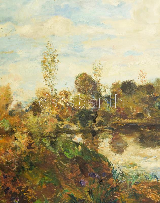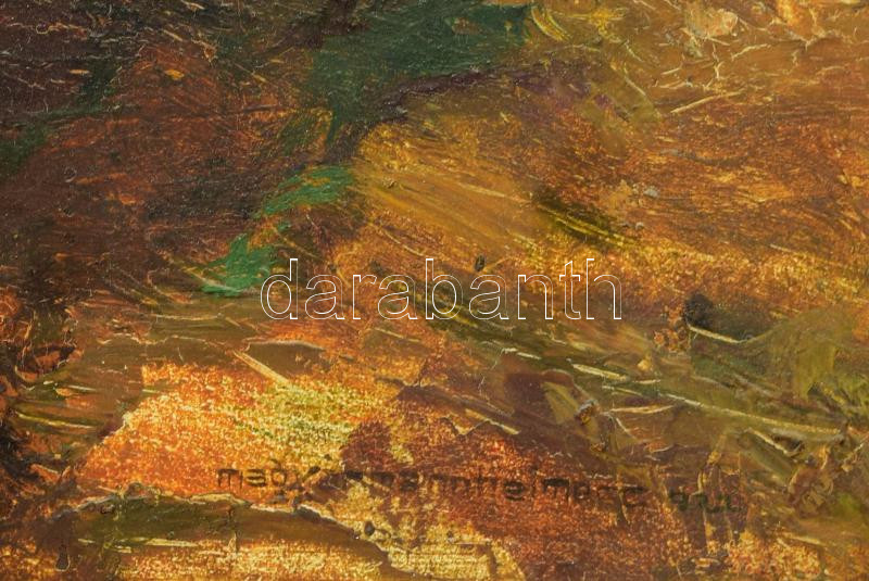 Magyar Mannheimer Gusztáv (1859-1937): Tájkép. Olaj, fa. Jelezve jobbra lent. Proveniencia: BÁV, 56. képaukció, 1981 december, 150. tétel (katalógus 15. oldal). Hátoldalán BÁV 56. aukció raglapjával és egyéb töredékes raglappal. Dekoratív, sérült fakeretben. 50x75 cm / oli on wood, signed lower right, auctioned: BÁV 56th auction, 1981, lot 150, framed