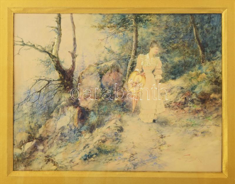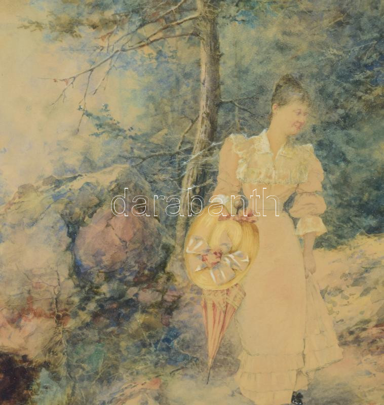 Neogrády Antal (1861-1942): Sétáló hölgy napernyővel, 1893. Akvarell, papír, jelezve jobbra lent (Neogrády A 893). Üvegezett, sérült, fakeretben, 26×34 cm. Rendkívül korai munka a festő életművéből, 1893-ból! / watercolour on paper, signed and dated (Neogrády A 893). The painter's very early work from 1893!