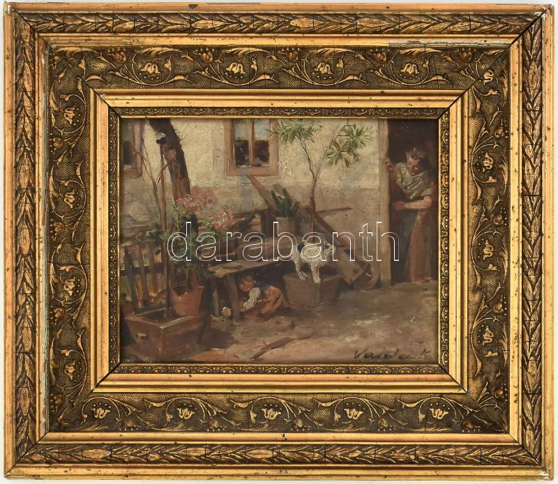 Vajda Zsigmond (1860-1931): Kisgyerek és cica az udvaron. Olaj, fatábla, jelzett. Dekoratív, kissé sérült fakeretben, 16×21 cm / oil wood, signed, framed