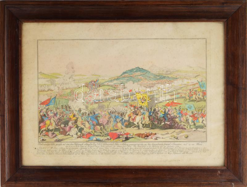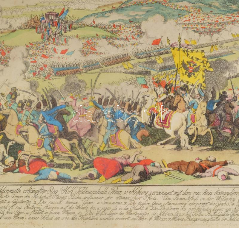 [Az osztrák és orosz seregek legyőzik a törököket a Rymniki csatában]. Will, Johann Martin: Merkwürdig kühn gewagter mit römischen Heldenmuth erkämpfter Sieg des k. k Feldmarschall Prinz v. Koburg. ca 1787. Színezett rézmetszet, üvegezett keretben, kissé foltos 40x26 cm / Austrian and Russian forces defeating Turkish forces in the Russian Turkish war. Colored engraving. In glazed frame