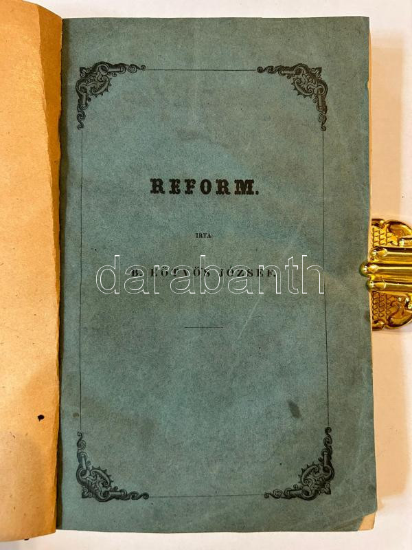 Eötvös József, b(áró): Reform Lipcse, 1846. Köhler Károly Ferencznél. 297+(1)p. Első kiadás. Az 1840-es években Eötvös Batthyány Lajos és Teleki László mellett a főrendi ellenzék egyik vezére volt. Széchenyi és Kossuth vitájában az utóbbi pártjára állt (,,Kelet népe és Pesti Hírlap"). Amikor a Pesti Hírlap főszerkesztője barátja, Szalay László lett, itt jelentette meg a parlamentáris kormányzás mellett érvelő cikksorozatát. Ezeket foglalta egybe önállóan e kötetben. Korabeli aranyozott gerincű egészvászon kötésben, korabeli papírborító bekötve. Szentkirályi: 19.3.