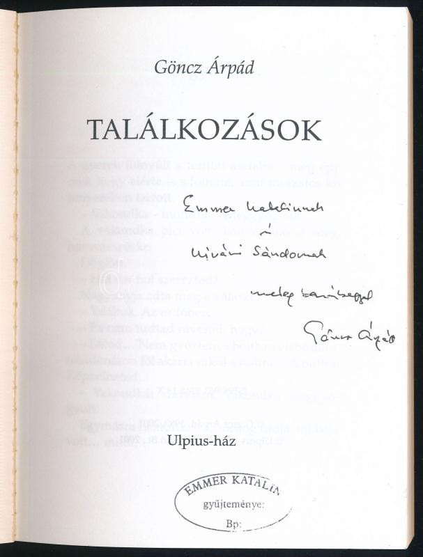 Göncz Árpád: Találkozások. DEDIKÁLT példány! Bp., 2001, Ulpius. Kiadói... https://www.darabanth.com/hu/43-Nagyaukcio/43.1/Konyvek/Konyvek-Egyeb-ritkasagok~17601/Goncz-Arpad-Talalkozasok-DEDIKALT-peldany-Bp-2001-Ulpius-Kiadoi-papirkotes~II3235445