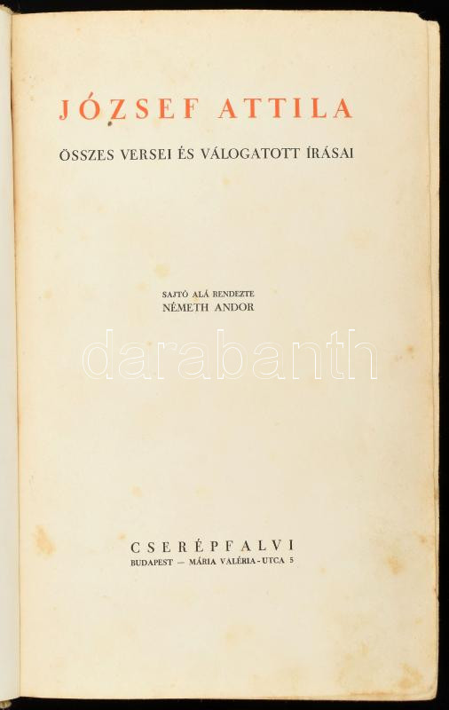 József Attila összes versei és válogatott írásai. Sajtó alá rendezte Németh Andor. Bp., Cserépfalvi. 489/1000 számozott példány. Kiadói egészvászon kötés, ceruzás bejegyzésekkel, foltos lapok, kopottas állapotban.