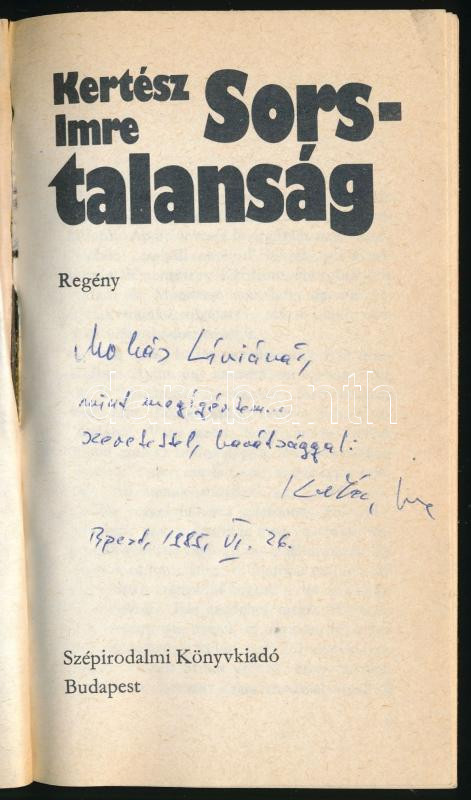 Kertész Imre: Sorstalanság. Zsebkönyvtár. A szerző, Kertész Imre (1929-2016) Nobel- és Kossuth-díjas magyar író által Mohás Lívia (1928-2024) pszichológus, József Attila-díjas író részére DEDIKÁLT példány! Bp., 1985, Szépirodalmi Könyvkiadó, 292+4 p. 2. kiadás. Kiadói papírkötés.