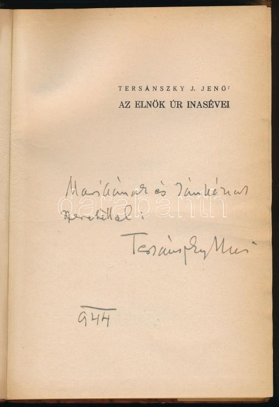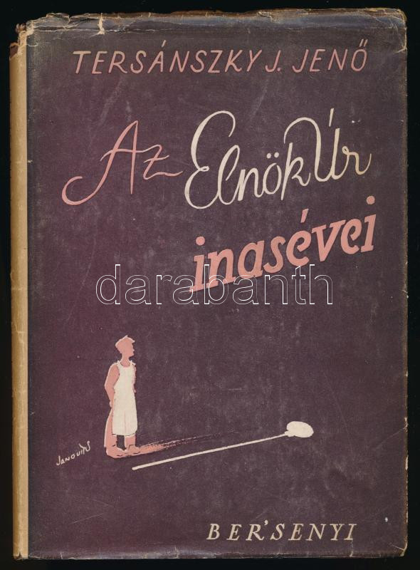 Tersánszky J. Jenő: Az elnök úr inasévei. A szerző, Tersánszky Józsi Jenő (1888-1969) Kossuth- és Baumgarten-díjas író által Jankovich Ferenc (1907-1971) Kossuth-, József Attila- és Baumgarten-díjas költő, író, műfordító és felesége részére DEDIKÁLT példány. Regény. [Bp.],(1943.), Ber'senyi, 203 p. Első kiadás. A borító Janovits István munka. Kiadói kartonált papírkötés, kiadói illusztrált papír védőborítóban, a gerinc felső részén kis hiánnyal, szakadt, kissé hiányos papírborítóval.
