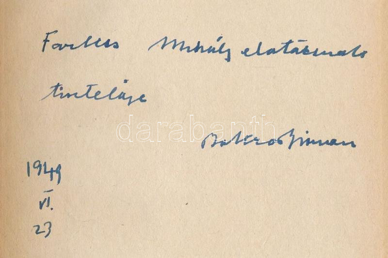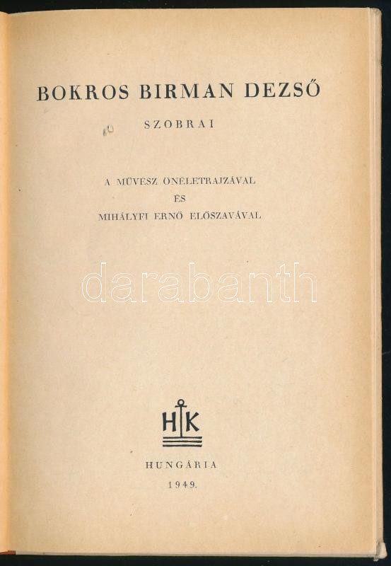 Bokros - Birman Dezső szobrai. A művész önéletrajzával és Mihályfi Ernő előszavával. A művész, Bokros Birman Dezső (1889-1965) szobrász- és festőművész által Farkas Mihály (1904-1965) kommunista politikus, honvédelmi miniszter részére DEDIKÁLT példány. "Farkas Mihály elvtársnak tisztelője.1949. VI. 23." Bp., 1949, Hungária, 16 p.+16 (fekete-fehér képtáblák) t. Kiadói illusztrált félvászon-kötés, kissé kopott borítóval.