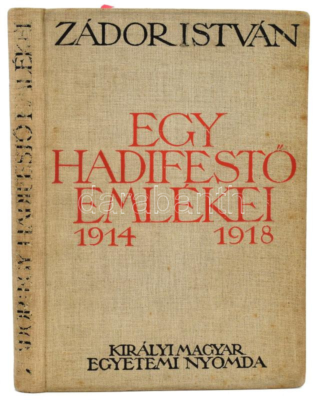 Zádor István: Egy hadifestő emlékei 1914-1918. Írta és rajzolta: - - 206 képpel. [Bp., 1933.], Kir. M. Egyetemi Nyomda, 247 p. Gazdag fekete-fehér képanyaggal illusztrált. Kiadói egészvászon-kötés, kopott, foltos borítóval. Számozott, 164. számú, a szerző, Zádor István (1882-1963) festő- és grafikusművész által ALÁÍRT példány!