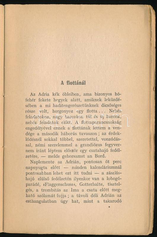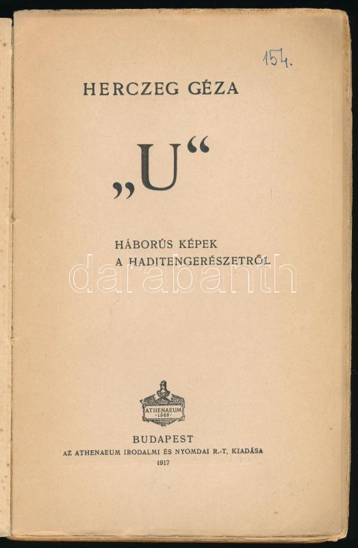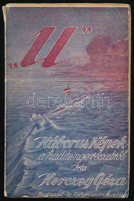 Herczeg Géza: "U". Háborús képek a haditengerészetről. Bp.,1917., Athenaeum, 163+1 p. A szerző, Herczeg Géza (1888-1954) író, újságíró, forgatókönyvíró, miniszteri tanácsos. Az első világháború alatt haditudósító, 1918-ban a Károlyi-kormány sajtófőnöke volt. Kiadói papírkötés, a gerincen kis sérüléssel.