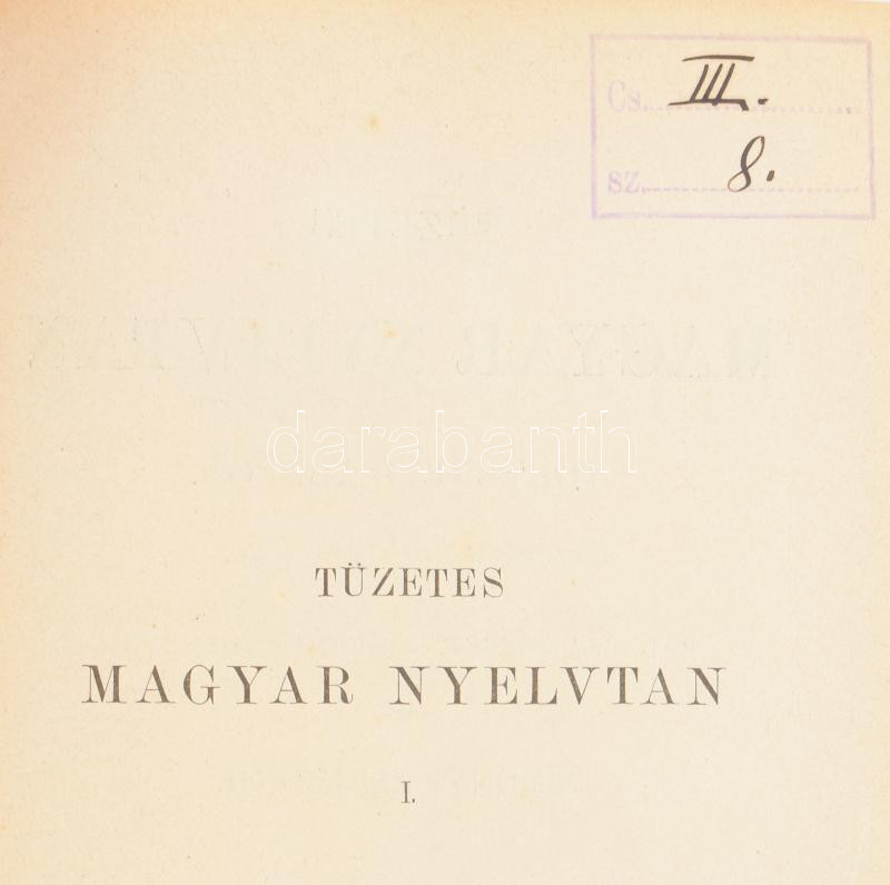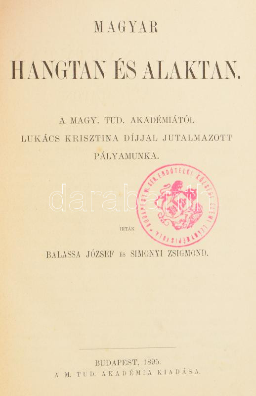 Balassa József - Simonyi Zsigmond: Magyar hangtan és alaktan. Tüzetes magyar nyelvtan történeti alapon I. köt. (Unicus!) Bp., 1895, MTA (Hornyánszky-ny.), XVI+734+(2) p. Kiadói aranyozott gerincű egészvászon-kötés, kissé foltos, kopottas borítóval, belül nagyrészt jó állapotban, intézményi bélyegzőkkel. Ritka!