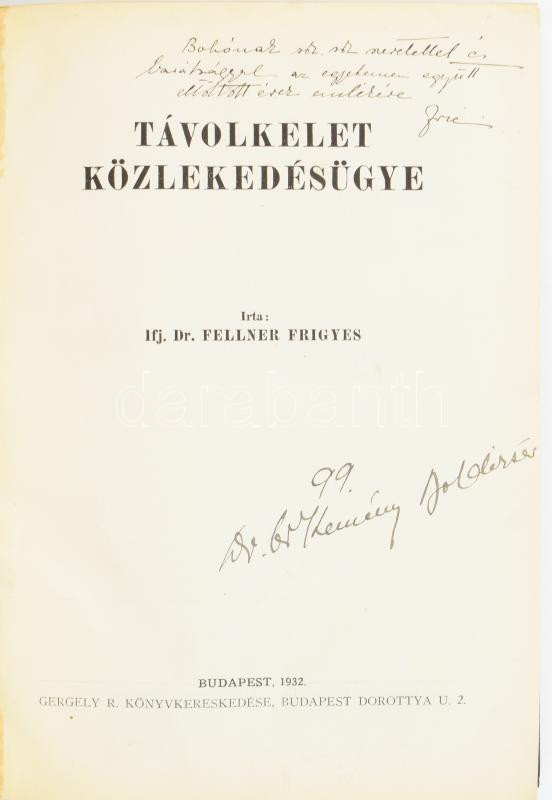 Fellner Frigyes, ifj.: Távolkelet közlekedésügye. A szerző, ifj. Fellner Frigyes (1908-1940) közgazdász, egyetemi magántanár által egyetemi diáktársa, Báró magyargyerőmonostori Kemény Boldizsár (1908-1983) részére DEDIKÁLT! Budapest, 1932, Gergely R. (Springer Gusztáv ny.) 255 + [1] p. + 3 t. (ebből 2 kihajtható) + 1 térkép. Egyetlen kiadás. Korabeli félvászon kötésben, címlapon Báró magyargyerőmonostori Kemény Boldizsár (1908-1983) névbejegyzésével, kissé sérült gerinccel, kissé laza kötéssel. A kötetben a szerző elsősorban Kína, Hongkong, Japán, Sziám (Thaiföld), Korea közlekedését veszi figyelembe, kitér vasútra, hajózásra, útügyre, automobilizmusra, légi közlekedésre, érinti a kommunikációt (posta, telefon, távíró, szikratávíró) és taglalja a különböző földrészekhez való közlekedési kapcsolatokat is.