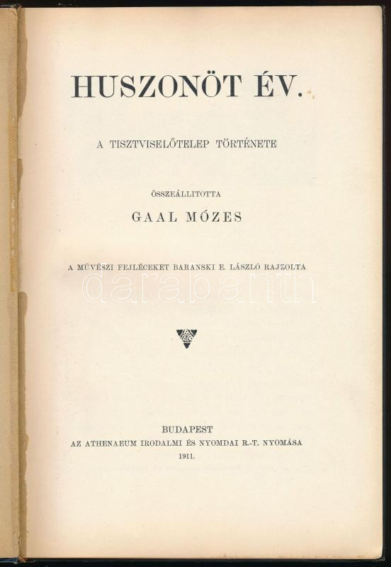 Gaal Mózes: Huszonöt év. A Tisztviselőtelep története. Összeáll.: - - . A művészi fejléceket Baranski E. László rajzolta. Bp., 1911, Athenaeum, 115 p. Fekete-fehér képekkel illusztrált. Kiadói aranyozott egészvászon-kötés, kissé kopott borítóval.