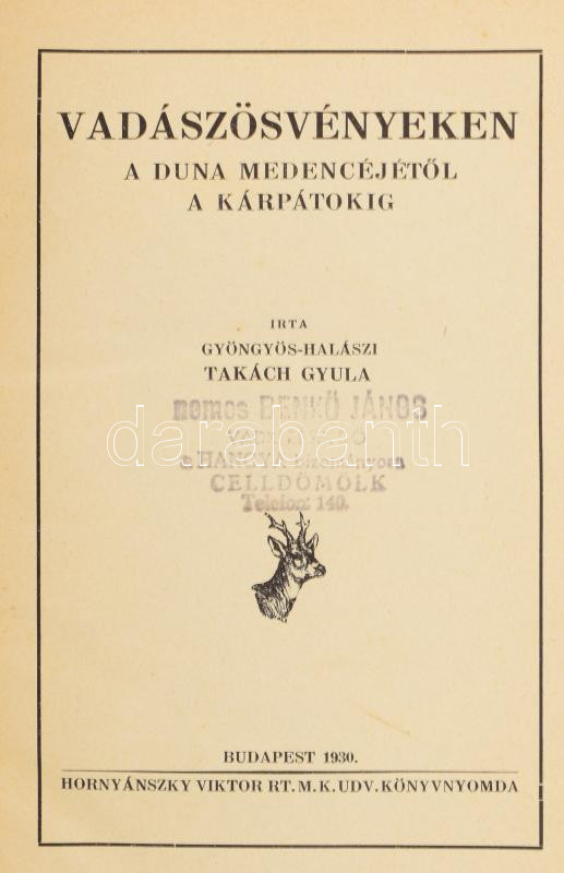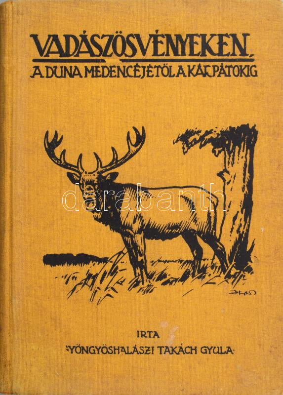 Takách Gyula, Gyöngyös-halászi: Vadászösvényeken a Duna medencéjétől a Kárpátokig. Bp., 1930., Hornyánszky Viktor,. 218+1 p. Az oldalszámozáson belül egészoldalas és szövegközti fekete-fehér képekkel illusztrált. Kiadói egészvászon-kötés, foltos borítóval.