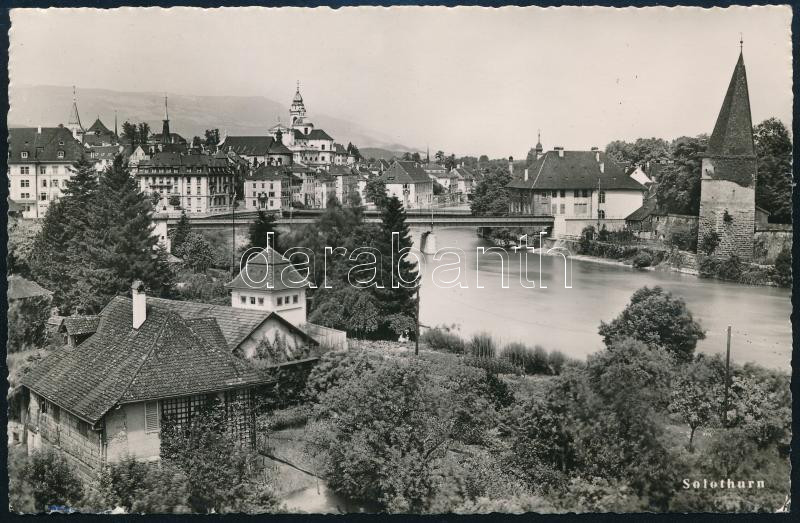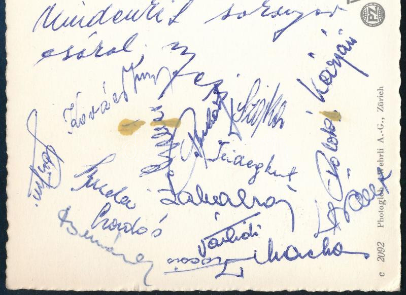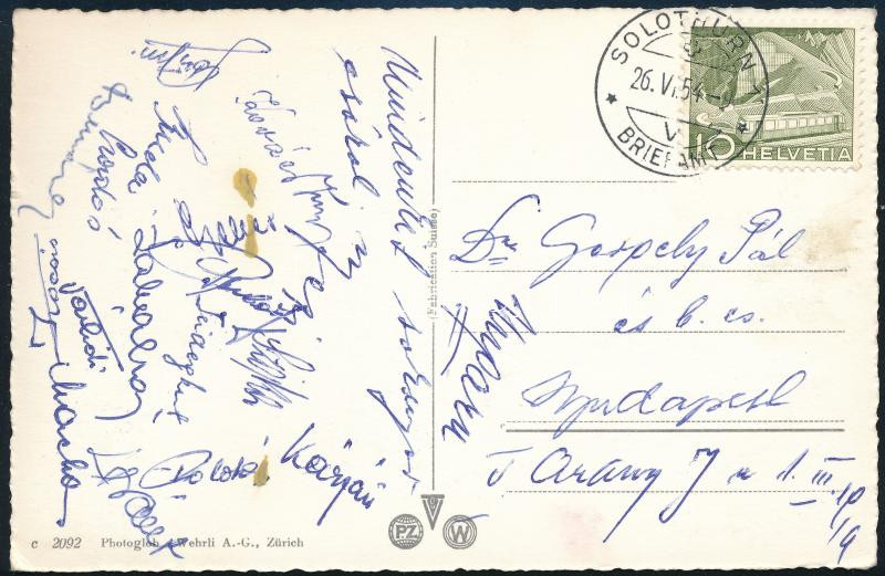 1954.VI.26. Az Aranycsapat tagjai által aláírt képeslap a svájci világbajnokságról, rajta: Puskás Ferenc, Buzánszky Jenő, Kocsis Sándor, Hidegkuti Nándor, Loránt Gyula, Czibor Zoltán, Gulyás Géza, Machos Ferenc, Gellér Sándor, Szojka Ferenc, Csordás Lajos és más játékosok autográf aláírásaival (össz. 17 db aláírás.) / Autograph signed poscard of the Hungarian national football team (Golden Team) from the 1954 FIFA World Cup in Switzerland, with signatures of Puskás and other players (17 in total)