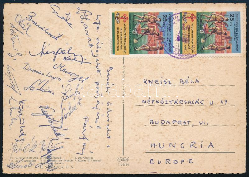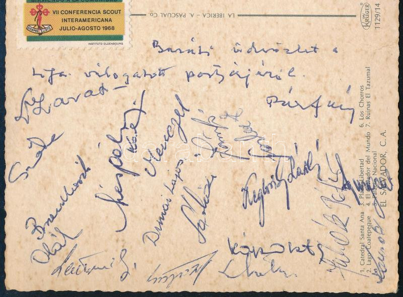 1969 A magyar labdarúgó válogatott tagjai által aláírt képeslap a Braziliából: Menczel, Dimai, Sárközi, Zámbó, Szőke, Oláh, stb / Autograph signed postcard of the Hungarian football team from Brasil