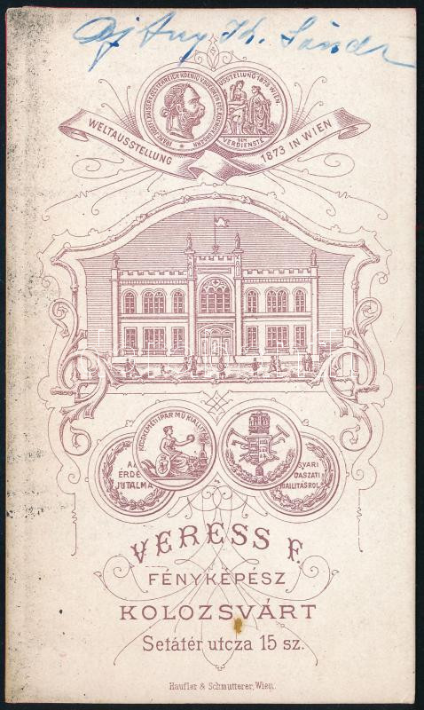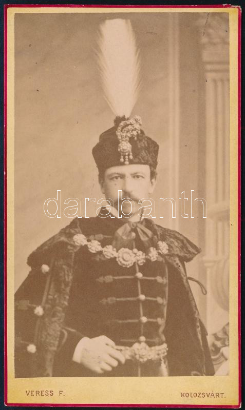 cca 1880 Ajtay Kovách Sándor (1845-1917) orvos, kutató díszmagyarban, keményhátú fotó Veress Ferenc kolozsvári műterméből, hátoldalon a műterem képével, 10,5×6,5 cm