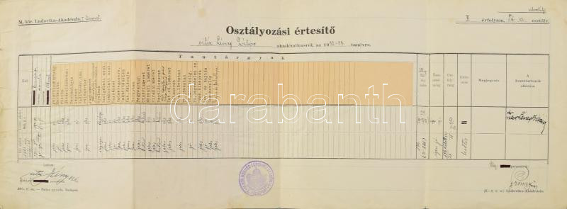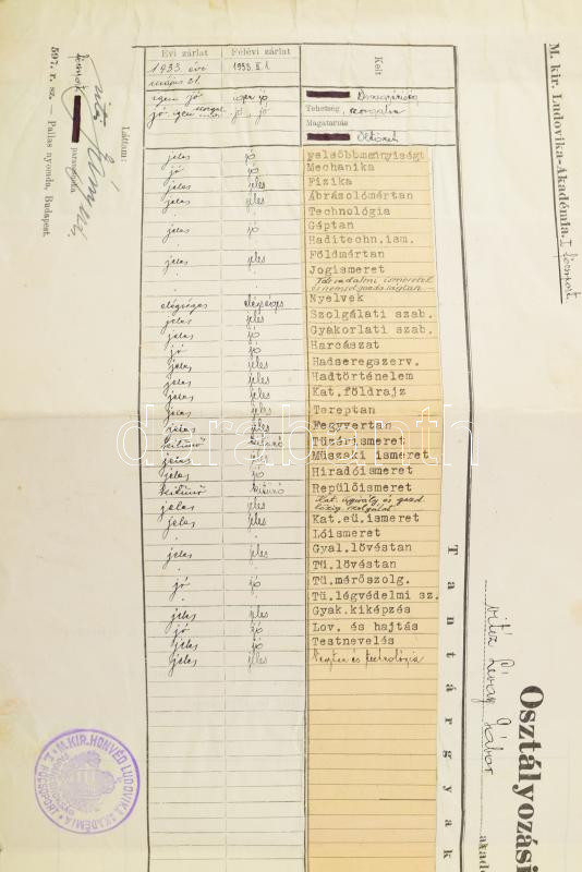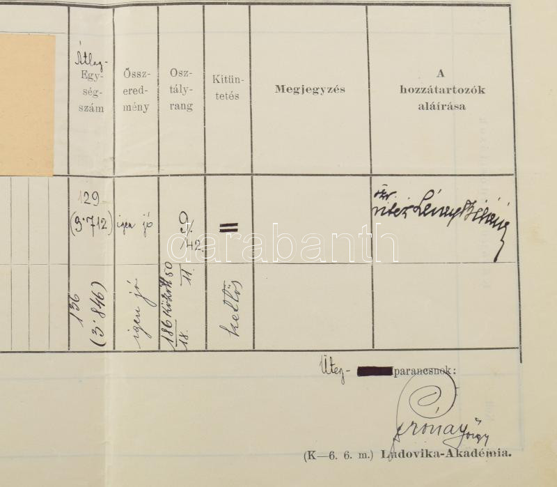 1933 M. Kir. Honvéd Ludovika Akadémia I. főcsoportjának osztályozási értesítője vitéz Lévay Gábor akadémikusról (1943-1944-ben százados) az 1932-33. tanévre (III. évfolyam, tüzér alosztály); vitéz Jány Gusztáv (szül. Hautzinger) (1883-1947) főcsoport-parancsnok, m. kir. honvéd tábornok (1934-től), 1940 és 1943 között a 2. magyar hadsereg parancsnoka; illetve vitéz Prónay Valter (1892-1974) őrnagy, ütegparancsnok autográf aláírásával, bélyegzővel. Hajtva, kis lapszéli sérülésekkel, gyűrődésekkel, 21,5x60,5 cm