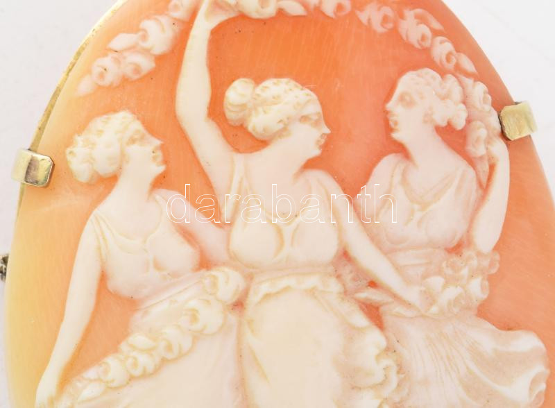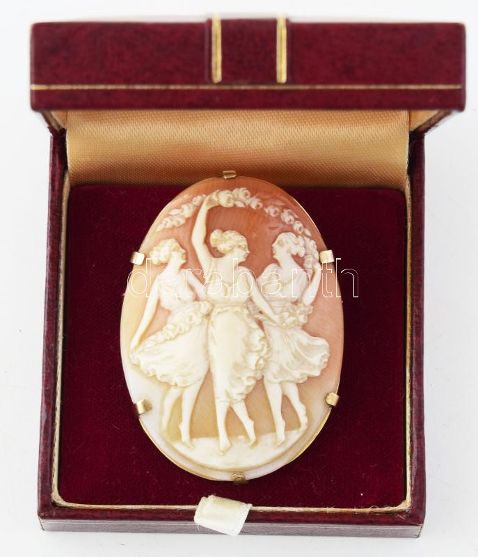 Kámea bross, 14k arany (Au) szerelékben, jelzés nélkül, díszdobozban, 5x4 cm /// Cameo brooch, set in 14k gold (Au), unmarked, in a decorative box, 5x4 cm.