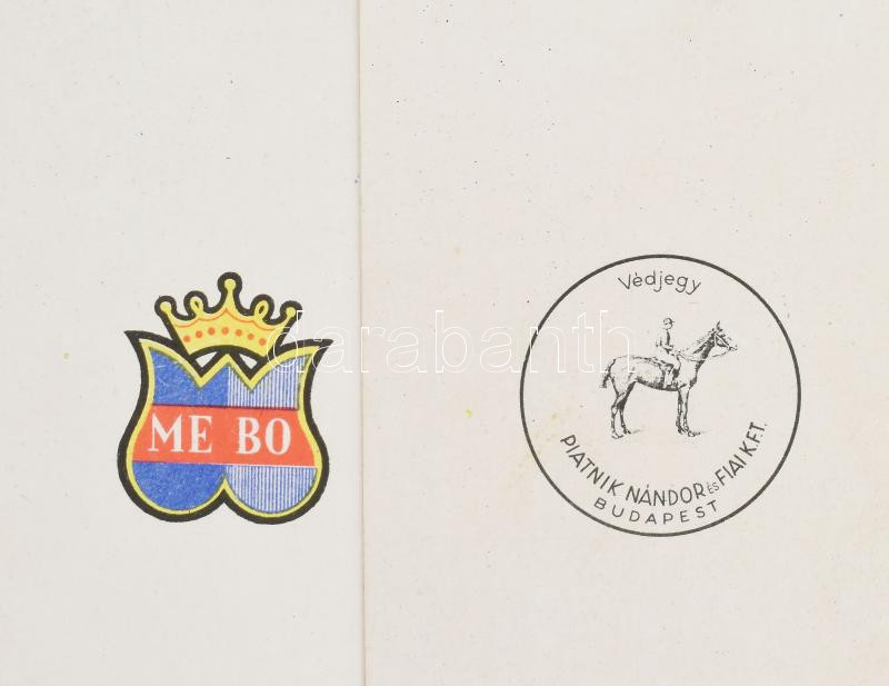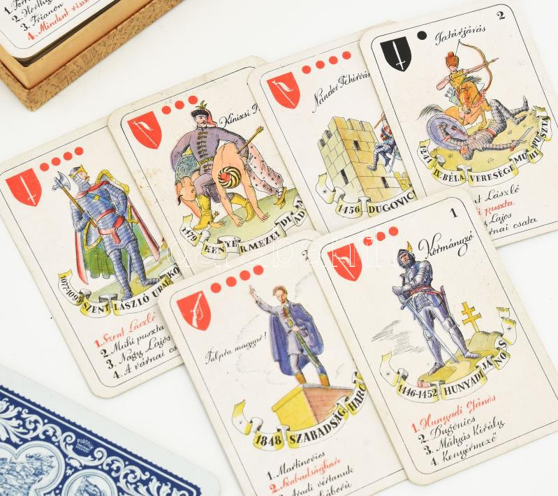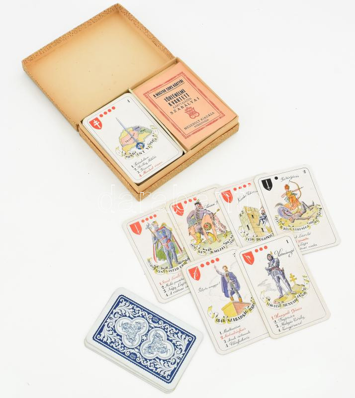 Magyar sors kártyái. Történelmi kvartett. Kártyajáték, cca 1940-1942, Piatnik Nándor és Fiai Rt., kiadó: MEBO (Mesebolt, Nyíregyháza), grafikus: Pályi Jenő (1900-1953), 32 lap, teljes, eredeti szabálykönyvvel, eredeti dobozában, jó állapotban. /// Hungarian Fate Cards. Historical Quartet. Card game, circa 1940-1942, published by Nándor Piatnik and Sons Ltd., publisher: MEBO (Fairy Tale Store, Nyíregyháza), graphic artist: Jenő Pályi (1900-1953), 32 cards, complete, with the original rulebook, in its original box, in good condition.