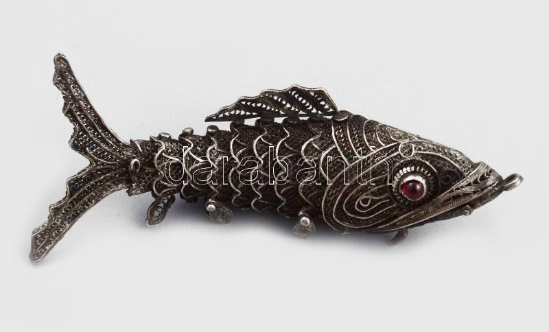 Leírás: Halfigura, filigrán ezüst (Ag) psumintartó. Jelzett: 84-es ezüstjel, h: 7 cm, 13g /// Fish figure, filigree silver (Ag) psumim holder. Marked: 84 silver hallmark, height: 7 cm, 13g