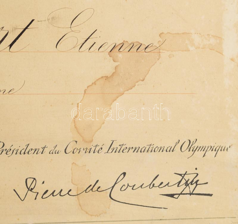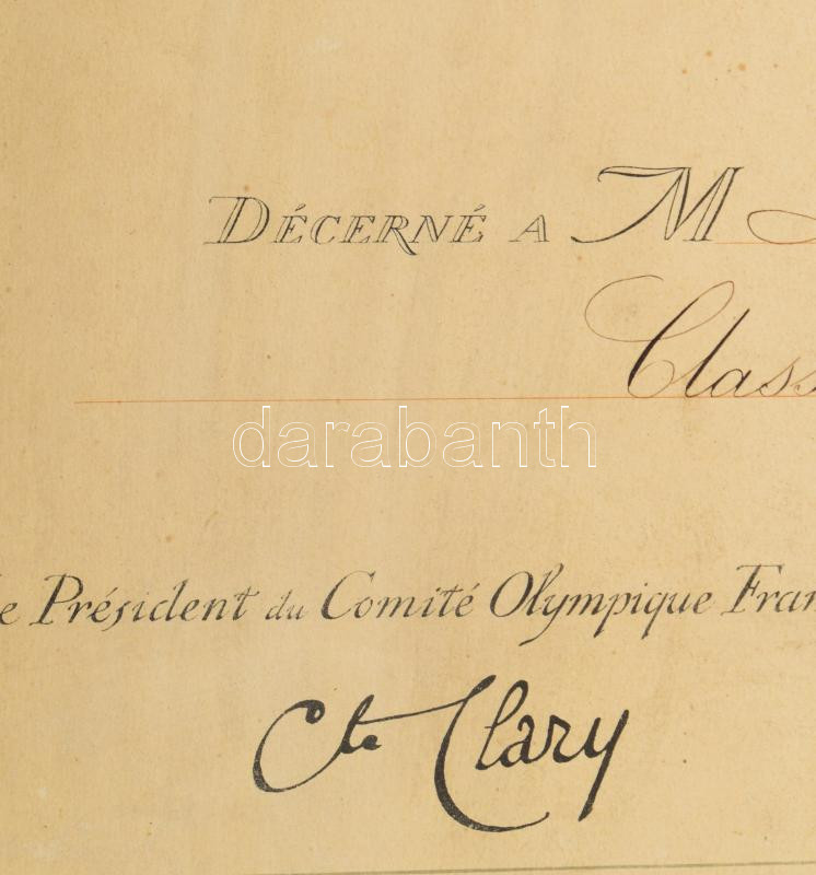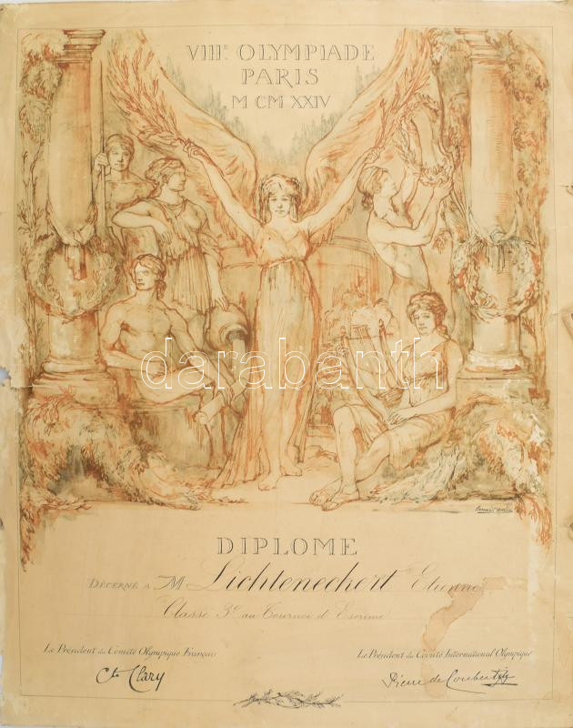 1924 Lichteneckert (Lichtneckert) István (1892-1929) tőrvívó, a bronzérmes magyar tőrcsapat tagjának díszoklevele az 1924. évi párizsi olimpiáról. Nagyméretű, dekoratív grafikával illusztrált oklevél (szign.: Bernard Nandin); Justinien Clary, a Francia Olimpiai Bizottság elnöke, ill. Pierre de Coubertin, a Nemzetközi Olimpiai Bizottság társalapítója és elnöke nyomtatott aláírásaival. Sérülésekkel, foltokkal, restaurálandó állapotban, 64,5x49,5 cm / 1924 Certificate of the 1924 Summer Olympics in Paris for István Lichteneckert (1892-1929) Hungarian fencer, who won a bronze medal in the team foil competition; with printed signatures of Justinien Clary, President of the French Olympic Committee, and Pierre de Coubertin, co-founder and President of the International Olympic Committee. With tears and stains, in need of restoration, 64.5x49.5 cm