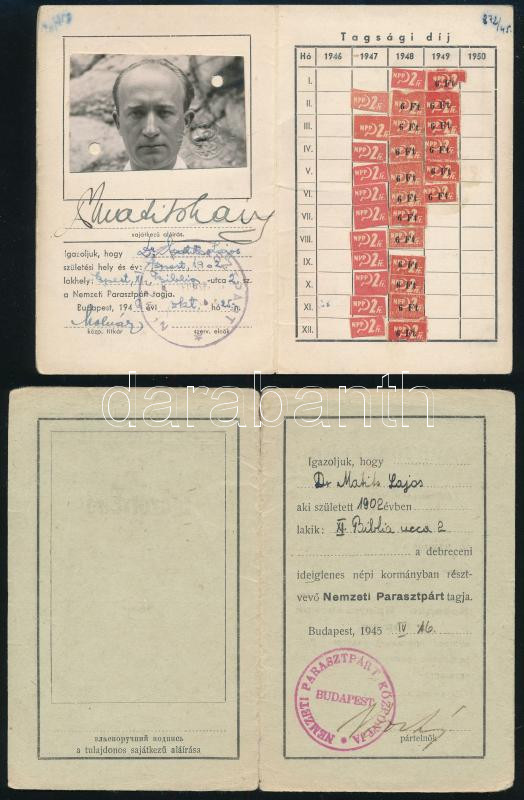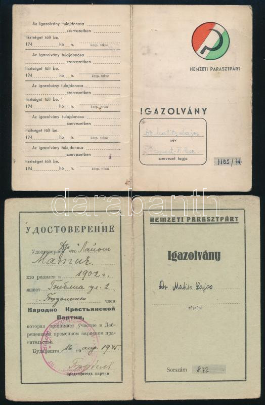 1945-1946 Nemzeti Parasztpárt igazolványai Matits Lajos (1902-1972) a Kékes-Szálló magaslati gyógyintézet főorvosa részére, az egyik fényképes (1946. okt. 25. kiállítás), a másik orosz nyelvű is (1945. aug. 16.), a későbbiben tagsági bélyegekkel is.