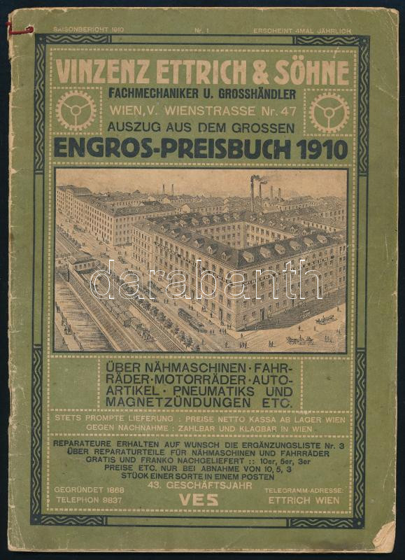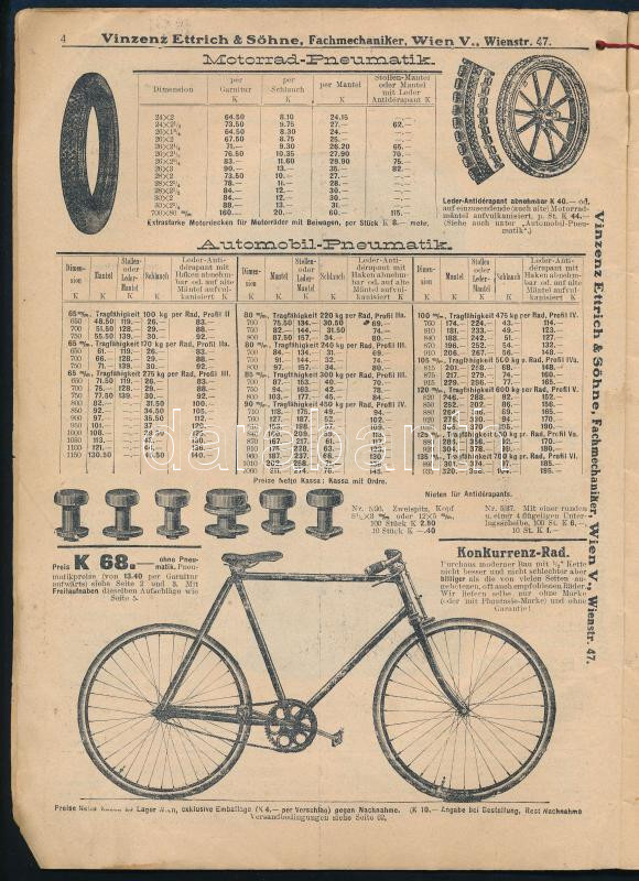 1910 Vinzenz Ettrich & Söhne Fachmechaniker u[nd] Grosshändler. Auszug aus dem grossen Engros-Preisbuch 1910. Über Nähmaschinen, Fahrräder, Motorräder, Autoartikel, Pneumatiks und Magnetzündungen etc. Wien, Gebrüder Stiepel-ny., 66 p. Gazdag fekete-fehér képanyaggal illusztrált árukatalógus különféle fém alkatrészekkel és tárgyakkal pl. automobilokhoz, kerékpárokhoz, motorkerékpárokhoz, varrógépekhez...stb. Kiadói papírkötés, kopott, kissé szakadt borítóval, a felső sarkánál fűzött.