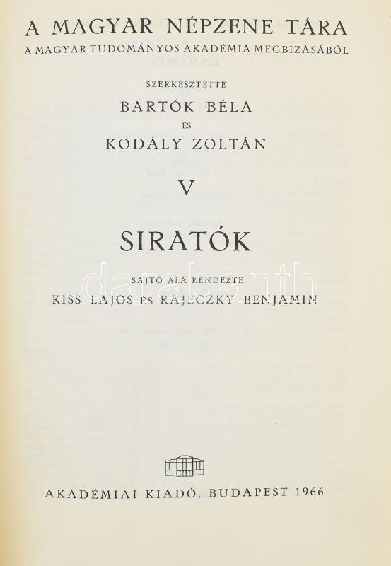 Magyar Népzene Tára V. Siratók. Sajtó alá rendezte: Kiss Lajos és Rajeczky Benjamin. Academia Scientiarium Hungarica. Corpus Musicae Popularis Hungaricae V. Bp., 1966., Akadémiai Kiadó, 1138+2 p. +13 (fekete-fehér képtáblák, kétoldalasak) t. Kiadói egészvászon-kötés, kissé kopott, szakadt kiadói papír védőborítóban. Megjelent 1000 példányban.