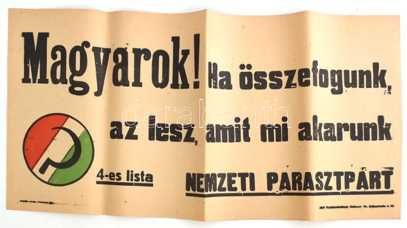 Leírás: 1947 "Magyarok! Ha összefogunk, az lesz, amit mi akarunk" - a Nemzeti Parasztpárt választási plakátja, hajtásnyommal, jó állapotban,