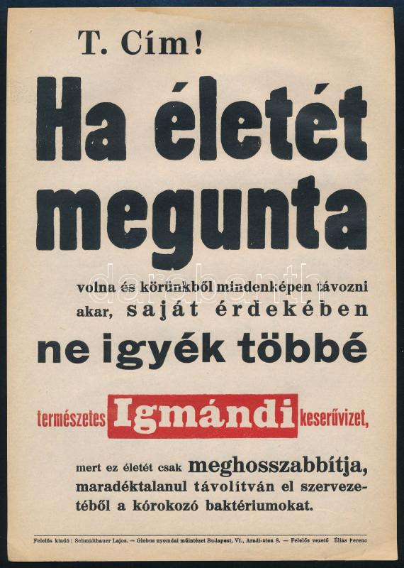 cca 1930 "Ha életét megunta volna és körünkből mindenképen távozni akar, saját érdekében ne igyék többé természetes Igmándi keserűvízet...", Schmidthauer-féle Igmándi keserűvíz reklám-, villamosplakát, Bp., Globus-ny., lap teteje kissé foltos, 24x17 cm