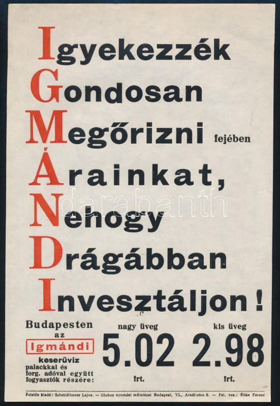 Leírás: cca 1930 "Igyekezzék gondosan megőrizni fejében árainkat...", Schmidthauer-féle Igmándi keserűvíz reklám-, villamosplakát, Bp., Globus-ny., jó állapotban, 24x17 cm