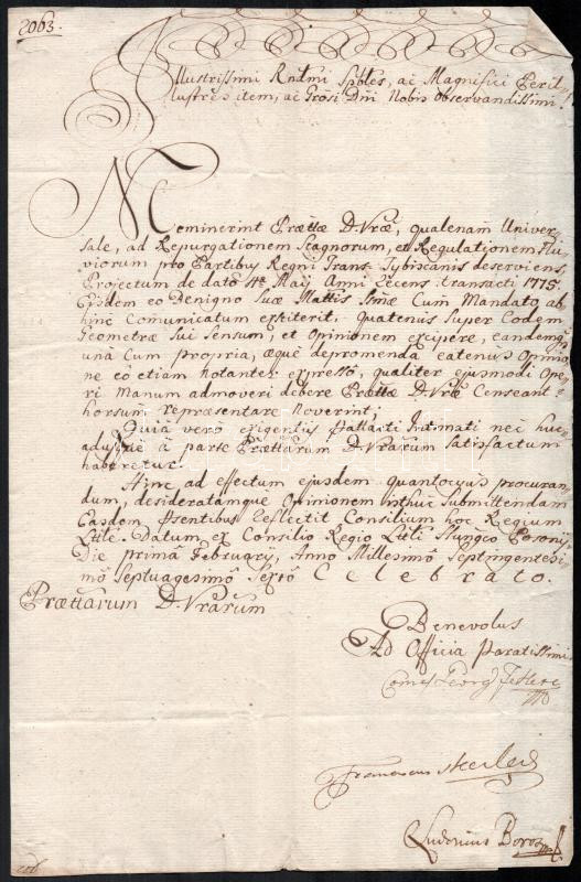 1776 Pozsony, latin nyelvű irat Halmi község (ma Halmeu, Románia) említésével, galánthai gróf Fekete György (1711-1788) országbíró, valóságos belső titkos tanácsos aláírásával, valamint két további aláírással: Franciscus (?), illetve Ludovicus Boros (Boros Lajos); megkímélt állapotban, viaszpecsét nélkül.