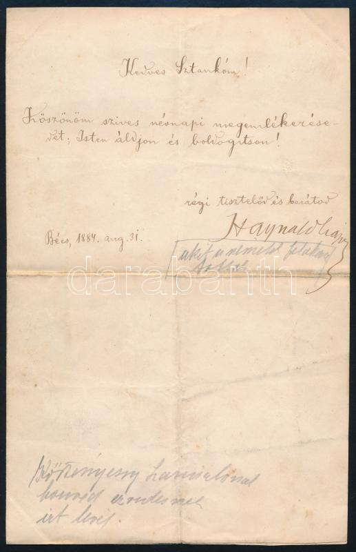 1884 Bécs, Haynald Lajos (1816-1891) kalocsai bíboros érsek, korábban erdélyi püspök, botanikus saját kézzel írt köszönő levele, aláírásával feltehetőleg Kőkényessy Szaniszló "Sztanka" (1817-1889) 48-49-es honvéd ezredes részére.