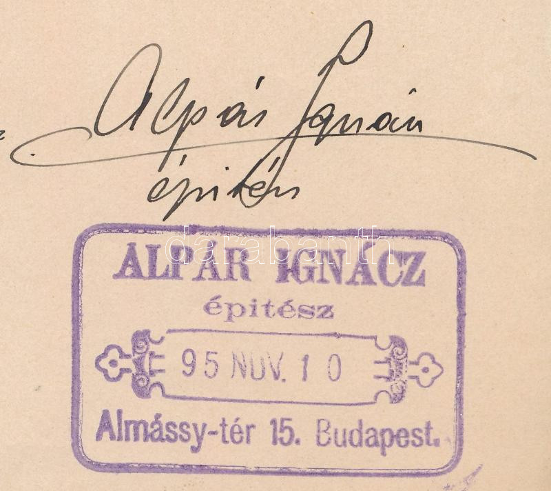 1895 Alpár Ignác (1855-1928) műépítész, egyetemi tanár, a századforduló eklektikus építészetének egyik vezéralakjának autográf aláírása Stobbe Adolf építőmester, Stobbe Kálmán (1883-1936) építőmester, díszlettervező, labdarúgó, a magyar válogatott edzője édesapjának munkáltatói bizonyítványán. "Nevezetesen közreműködött a herkulesfürdői Szapáry fürdőház utolsó elkészítési munkáin, s a segesvári megyeház terveinek s építési terveinek kidolgozásán, valamint több magán épület önálló vezetésében." Bp., 1895. nov. 10, Alpár Ignác építész bélyegzésével, 1 ft. és 15 kr. okmánybélyeggel.
