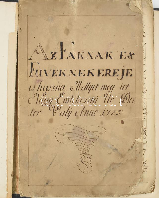 cca 1725 Az fáknak és füveknek ereje és haszna. Mellyet meg írt Nagy Emlékezetű Úr Doctor Valy Anno 1725. 90 kézzel beírt oldal. Betűrendben megírt szócikkek a különböző fák, növények gyógyászati alkalmazásáról. Szétvált fűzéssel, kissé sérült borítóval, 37 cm