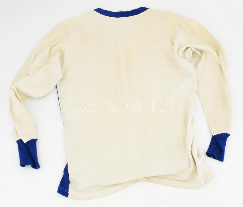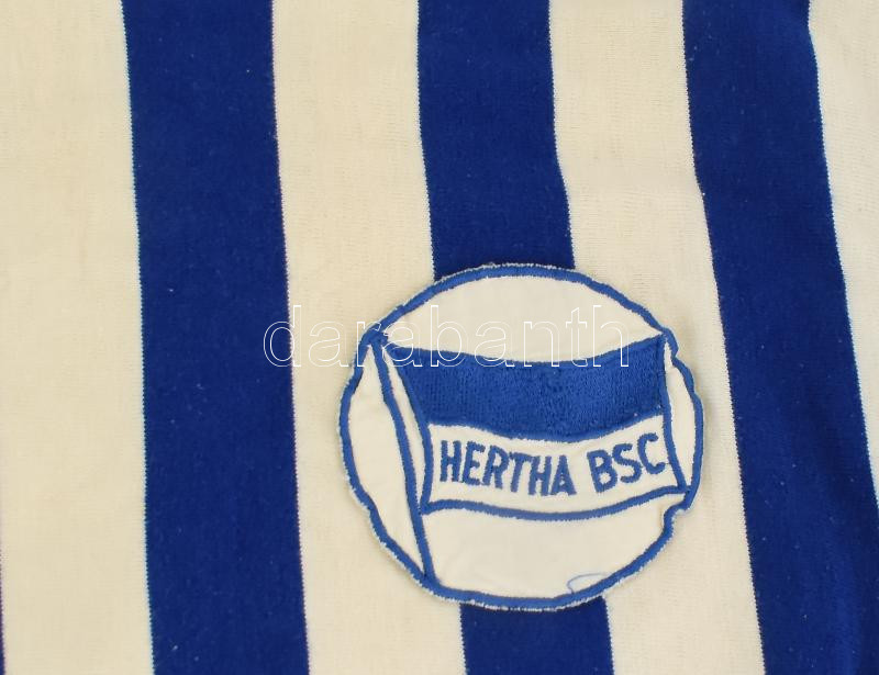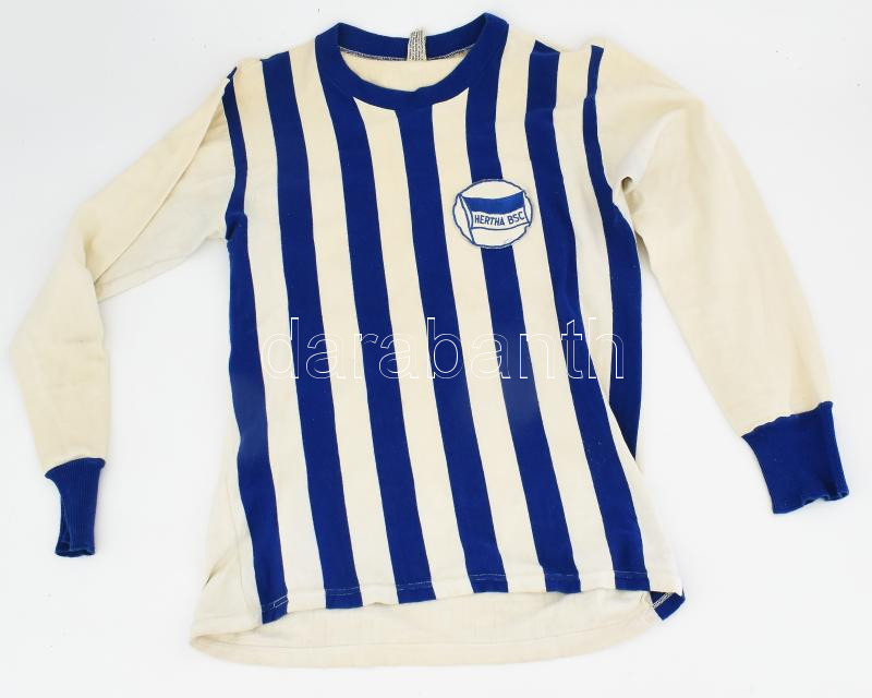 cca 1970-1972 Varga Zoltán (1945-2010) magyar válogatott labdarúgó, csatár edzőmeze a német Hertha BSC játékosaként töltött időszakából. A Hertha futballklub címerével ellátott, kék-fehér csíkos hosszú ujjú felső, korának megfelelő, megkímélt állapotban. Török Péter (1950?) sportújságíró, riporter gyűjteményéből. Varga Zoltán labdarúgói karrierjét a Ferencváros (FTC) csapatánál kezdte, ahol 1961 és 1968 között játszott; ez idő alatt 135 mérkőzésen 53 gólt lőtt, és négy bajnoki címet nyert a Fradi színeiben. A magyar válogatottban 1964-ben mutatkozott be, és 1968-ig volt a keret tagja, amely évben a mexikói olimpia során disszidált. A Nemzetközi Labdarúgó-szövetség által kiszabott két éves eltiltását követően a berlini Hertha színeiben tért vissza, ahol első idénye során a csapat meghatározó játékosa lett. Azonban az idény utolsó meccsének kapcsán történt bundabotrány miatt (több csapattársával együtt) újabb eltiltást kapott, amelynek következtében végül a skót Aberdeen FC-hez igazolt. Skócia után játszott még Hollandiában (az Ajaxnál), majd ismét Németországban (a Borussia Dortmundnál, illetve az Augsburgnál), valamint Belgiumban is. Később edzőként is jelentős karriert futott be, melynek során (a rendszerváltást követően) Magyarországra is visszatért.