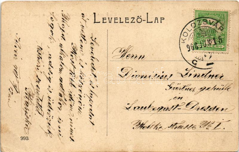 Leírás: 1908 Kolozsvár, Cluj; Első magy. általános biztosító társaság palotája, Magyar-Francia biztosító. W.L. (?) 993. / palace of the insurance company (EK)