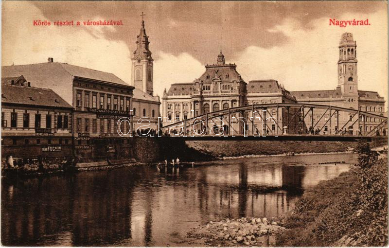 1912 Nagyvárad, Oradea; Körös részlet a Városházával, Gazdasági Iparbank, Janky Antal és Kiss Károly, Kálmán Sándor ékszerész, Mayer Pál üzlete, híd, fogműterem. Vidor Manó kiadása / Cris riverside, town hall, bank, shops, bridge, dentist