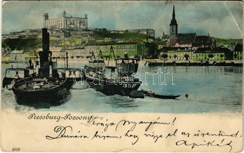 1899 (Vorläufer) Pozsony, Pressburg, Bratislava; vár, gőzhajó és uszál... https://www.darabanth.com/hu/430-Gyorsarveres/430.0/Kepeslapok/Felvidek~1500006/1899-Vorlaufer-Pozsony-Pressburg-Bratislava-var-gozhajo-es-uszaly-a-Dunan-castle-ste~II2761233