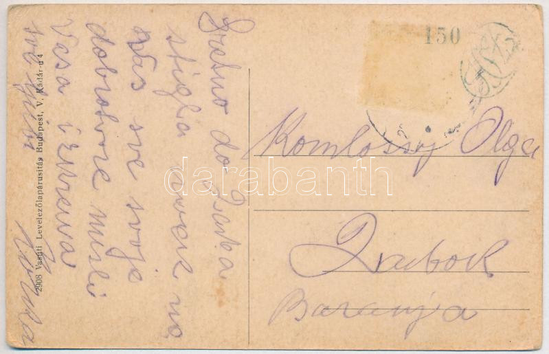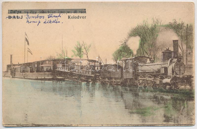 Leírás: Dálya, Dalja, Dalj (Erdőd, Erdut); Egy teherrész kompraállítása. Vasúti Levelezőlapárusítás 2908. / Die Auffahrt eines Lastzuges / ferry, locomotive, freight train (EK)