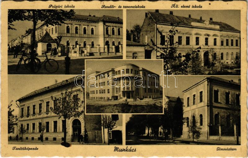 1939 Munkács, Mukacheve, Mukacevo; Polgári iskola, kerékpár, Rendőr- és tanonciskola, Állami elemi iskola, Tanítóképző, Gimnázium / school, bicycle, police school, teachers' training institute, high school