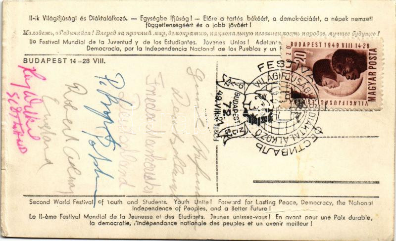 Leírás: 1949 Budapest, II. Világifjúsági és Diáktalálkozó. Egységbe Ifjúság! Románia, Csehszlovákia, Szovjetunió, Magyarország + So. Stpl (gyűrődés / crease)