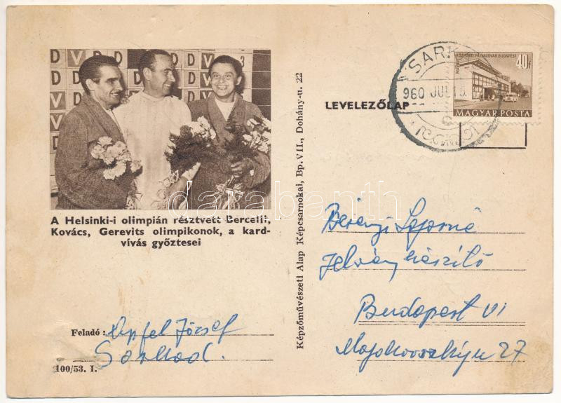 1953 A Helsinki-i olimpián részt vett Bercelli, Kovács Gerevits olimpikonok, a kardvívás egyéni és csoport győztesei. Képzőművészeti Alap Kiadóvállalat / Hungarian socialist-communist sport propaganda: winners of the Helsinki Olympics in fencing (lyukak / pinholes)