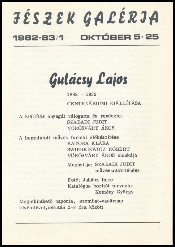 1982 Gulácsy Lajos (1882-1932) centenáriumi kiállítása a Fészek Galériában, 1982/83. Kiállítási ismertető prospektus, benne a kiállított művek jegyzékével, Gulácsy Lajos műveit ábrázoló diákkal (10 kocka). Kiadói tűzött papírkötés.
